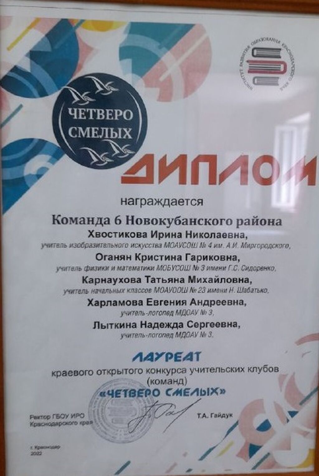 В 2022 году учителя клуба Созвездие стали лауреатами краевого открытого конкурса учительских клубов (команд) «Четверо смелых»: