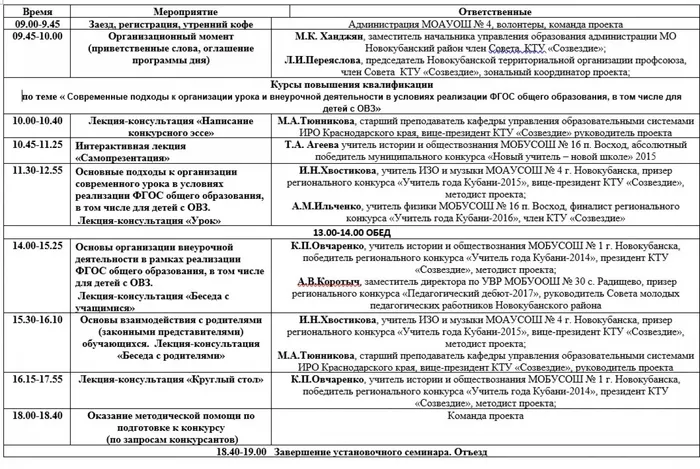 7 февраля 2020 года на базе МОАУСОШ № 4 им. А.И.Миргородского прошло второе мероприятие в рамках реализации проекта "Проведение зонального конкурса молодых педагогов общеобразовательных учреждений «Новый учитель – новой школе» со стажем работы от 1 года до 3 лет" при финансировании Фонда Президентских грантов, софиансировании Новокубанской районной организации Профсоюза и НЧОУ "Курсы Кубани". Установочный семинар собрал не только всех участников, но и их наставников-методистов. Все ораторы (члены КТУ "Созвездие") продемонстрировали прекрасное владение методикой организации урока и внеурочной деятельности в школе, раскрыли слушателям секреты профессионального мастерства. Каждое выступление подкреплялось практическими примерами из собственной педагогической и конкурсной практики. Все участники на церемонии закрытия конкурса 17 апреля 2020 года получат удостоверение о прохождении курсов повышения квалификации по теме "Современные подходы к организации урока и внеурочной деятельности в условиях реализации ФГОС общего образования, в том числе для детей с ОВЗ". Конкурсанты и их наставники, прощаясь с гостеприимной школой и организаторами, выражали благодарность за теплый прием и серьезное содержательное наполнение установочного семинара.