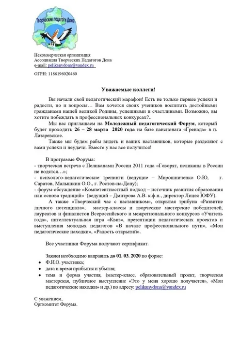 Мы приглашаем начинающих педагогов и их наставников на Молодежный педагогический Форум, который будет проходить 26 – 28 марта 2020 года на базе пансионата «Гренада» в п. Лазаревское.