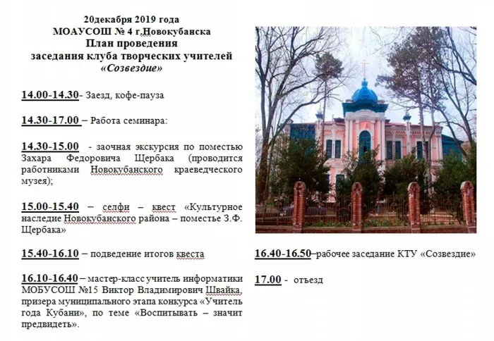 Сегодня в гостеприимной школе №4 г.Новокубанска состоялась очередная клубная встреча. Тема заседания - историко-культурное наследие нашего района. Участникам была предложена заочная экскурсия по усадьбе Захара Федоровича Щербака, представленная руководителем Новокубанского краеведческого музея Евгением Леонидовичем Замореевым. Затем на территории усадьбы был проведен селфи-квест. Все участники отметили, что данное мероприятие было позитивным и весьма познавательным.